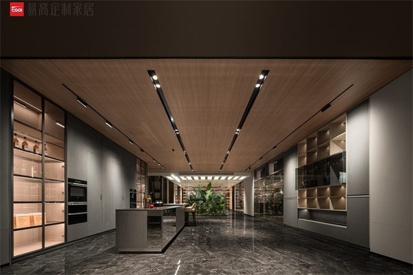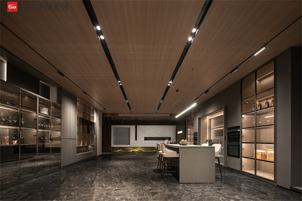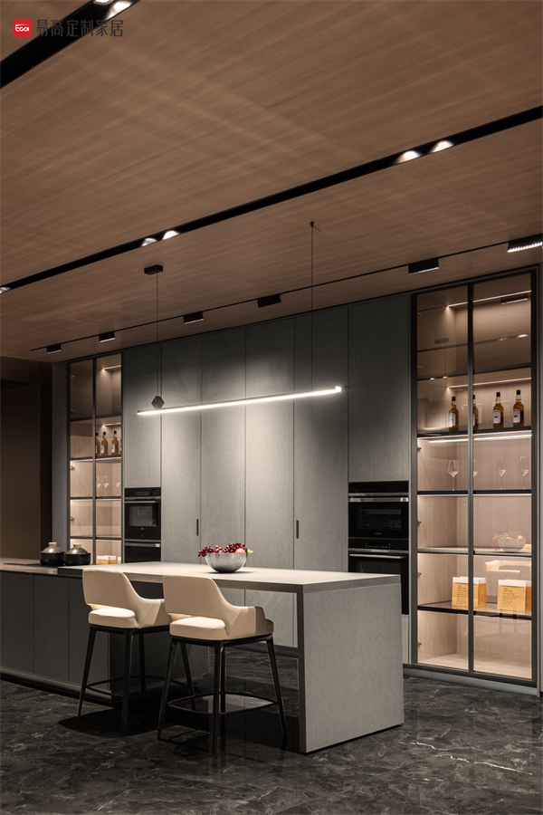 開放式西廚設(shè)計高端大氣,深灰色系的大面積鋪就暈染出神秘深邃的空間氛圍,體現(xiàn)對都市質(zhì)感生活的不懈追求。裝飾頂柜背板采用前后錯位設(shè)計,在燈光和玻璃的折射作用下將空間立體感層層推進,凸顯深厚的家居美學(xué)底蘊。