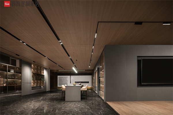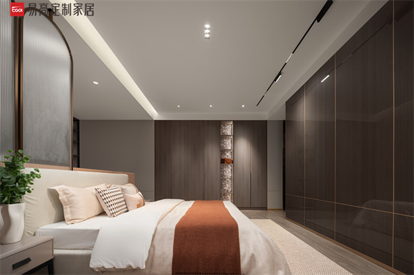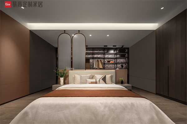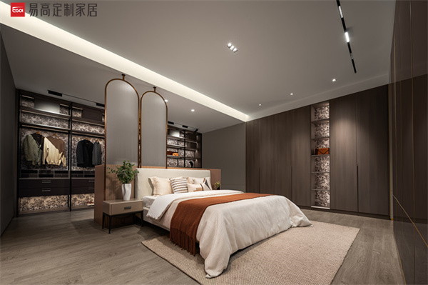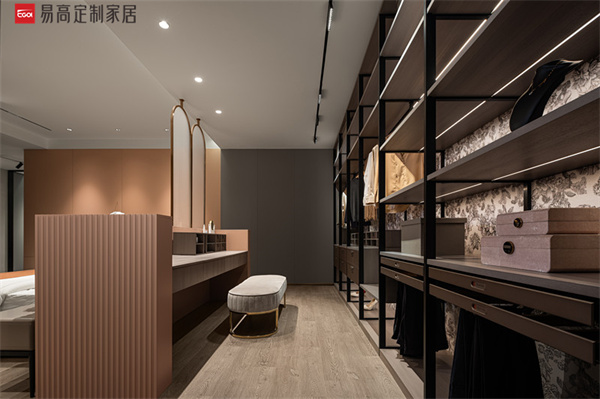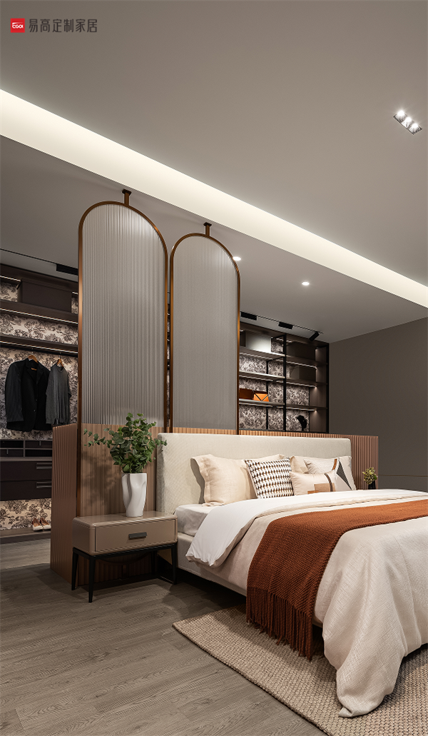 整個空間以利落的線條有序勾勒,盡顯奢雅的貴族姿態(tài)。掛衣區(qū)、收納區(qū)、梳妝區(qū)、休息區(qū)功能劃分明確,實現(xiàn)美學(xué)性和實用性的微妙平衡。背板獨特的絨花噴繪工藝,為空間注入不一般的時尚張力,如一幅藝術(shù)畫卷悄然綻放,熱情、悠然、不羈。
